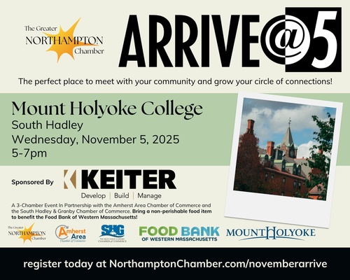 Join us for our monthly ARRIVE@5 networking event on Wednesday, November 5th, 2025, when we partner with Mount Holyoke College to present a multi-chamber evening of networking! Connect with your community and grow your circle of professional connections. We are so excited to be part of this multi-chamber event with the Amherst Area and South Hadley & Granby Chambers of Commerce. We encourage all guests to bring a non-perishable food item to this event; all donations will be delivered to the Food Bank of Western Massachusetts. Our thanks to Keiter for sponsoring this event! Bring a friend and introduce someone to our Chamber community!