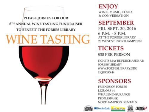 SIXTH ANNUAL WINE TASTING AT FORBES LIBRARY SET FOR SEPTEMBER 30