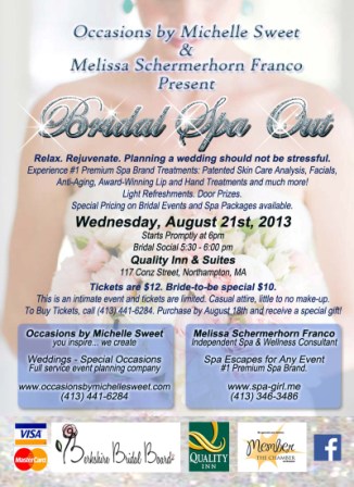 Bridal Spa Out.  Planning a wedding should not be stressful. Experience #1 Premium Spa Brand Treatments, Patented Skin Care Analysis, Facials, Anti-Aging, Award-Winning Lip and Hand Treatments and much more! Light refreshments. Door Prizes. Special pricing on Bridal Events and Spa Packages available. This is an intimate event and tickets are limited. Casual attire. Little to no make-up.